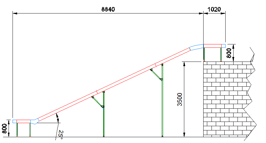 Incline/decline slider bed belt conveyor or floor to floor conveys goods from one elevation to another or from floor-to-floor. These conveyors have a belt running on top of a formed metal bed. The conveyor consists of either a mild steel or aluminium frame with pulleys at either end of the formed metal bed, with a continuous loop of belt which rotates about these pulleys. The powered pulley is normally centrally located allowing the conveyor to run in forward or reverse.